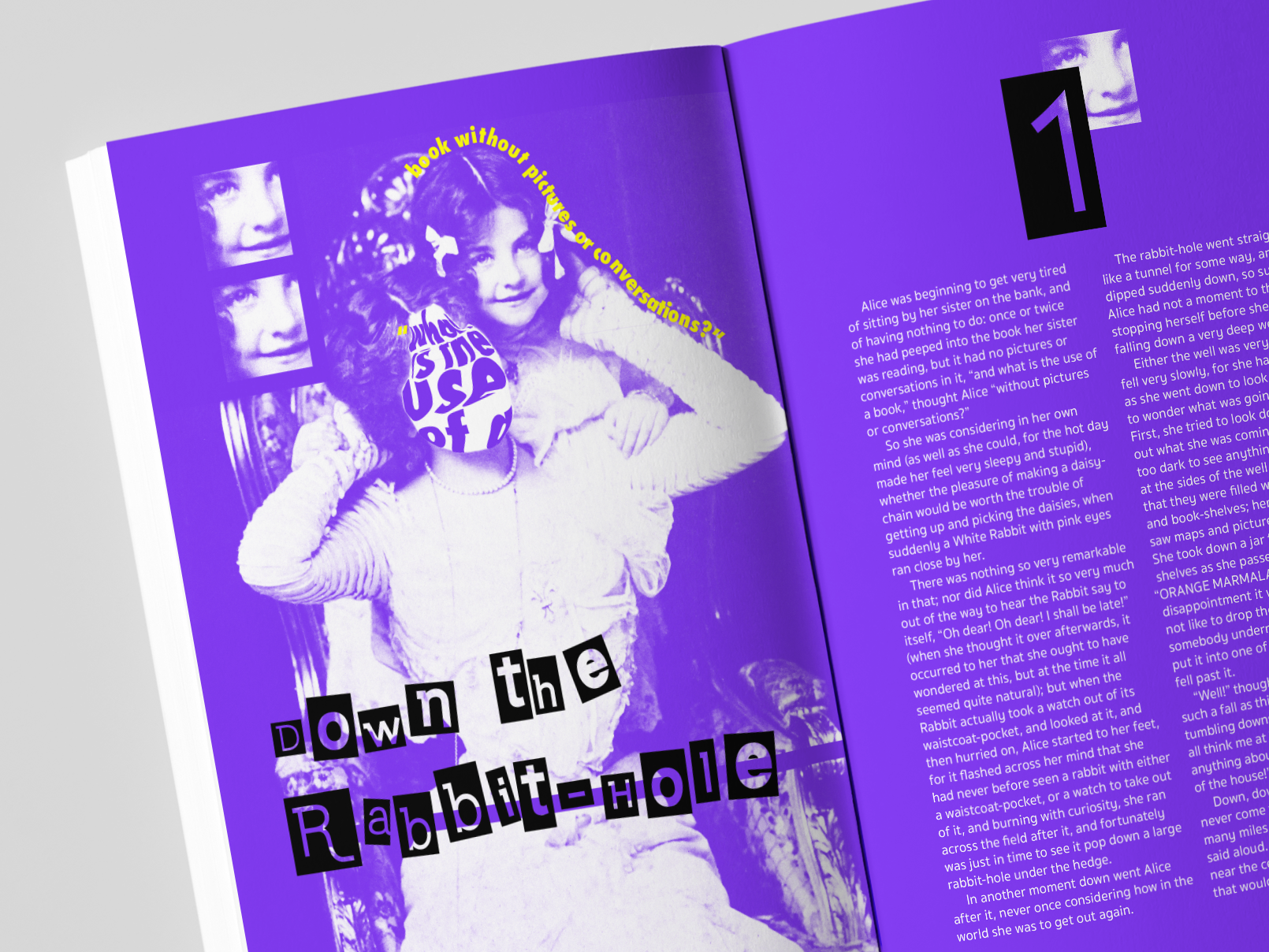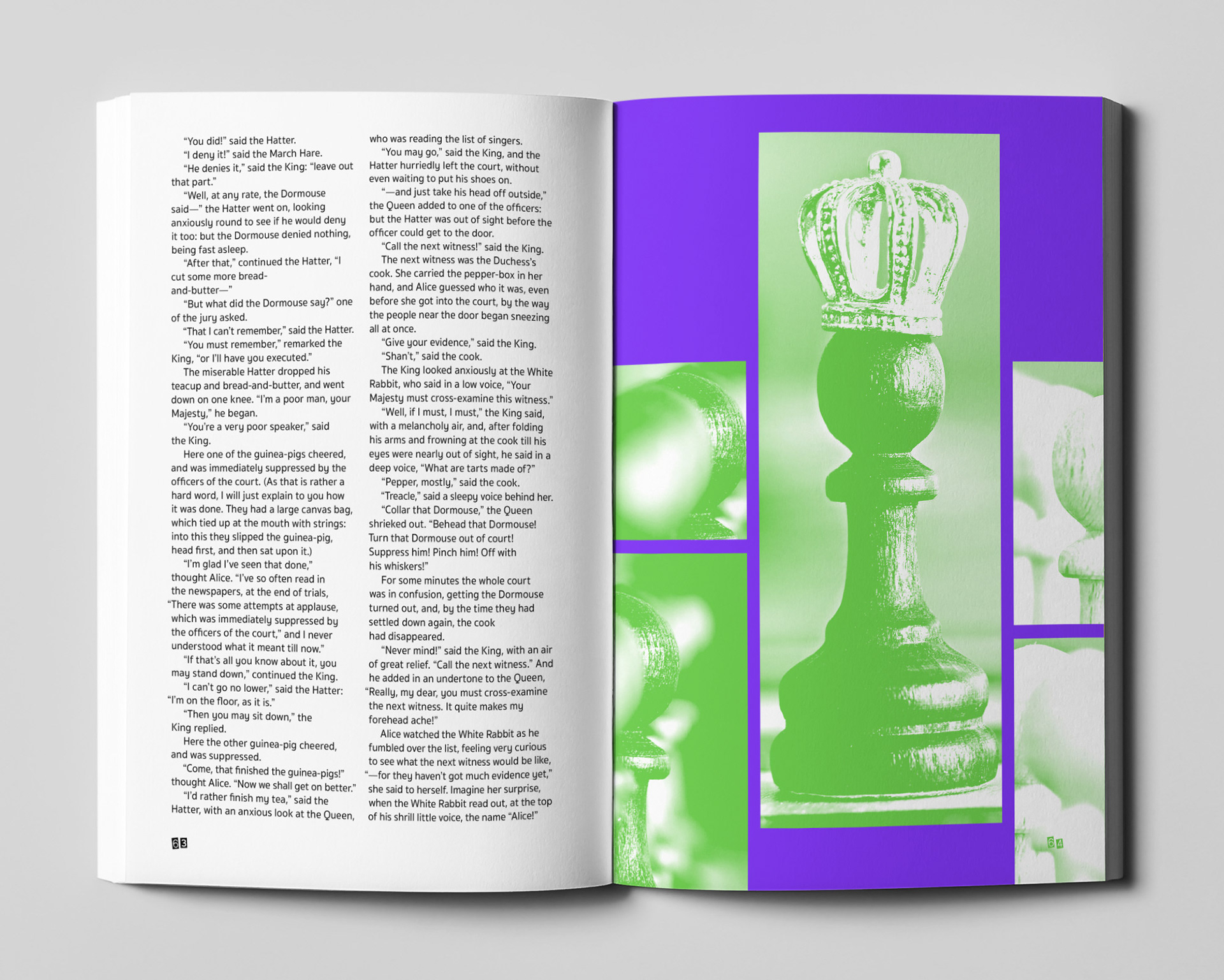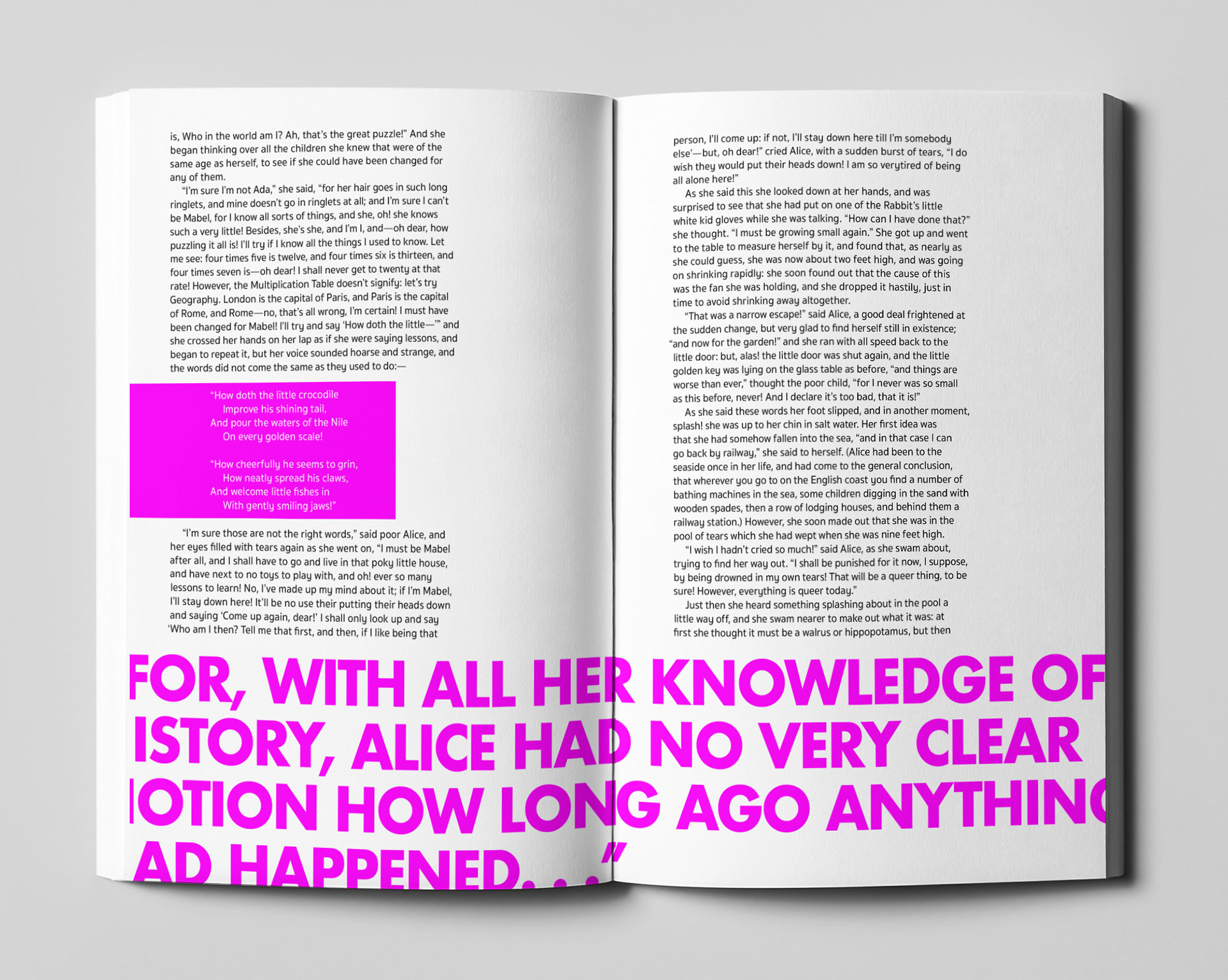 An eerie approach to “Alice’s Adventures in Wonderland” using vibrant colors, photographs, and experimental type. Won a AIGA Flux Award