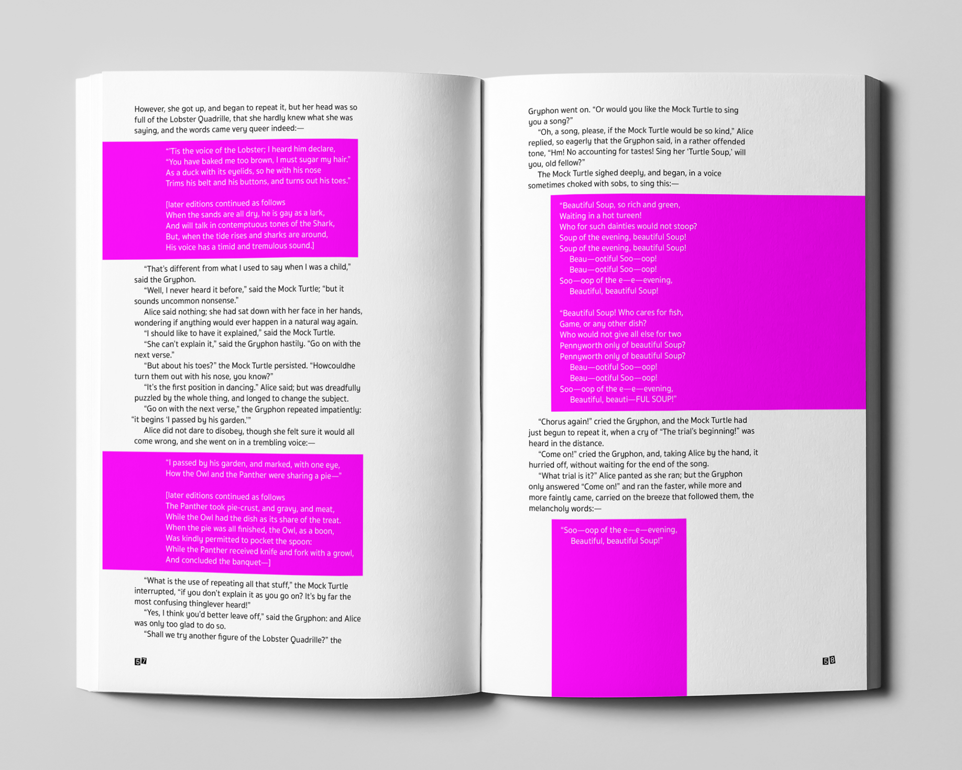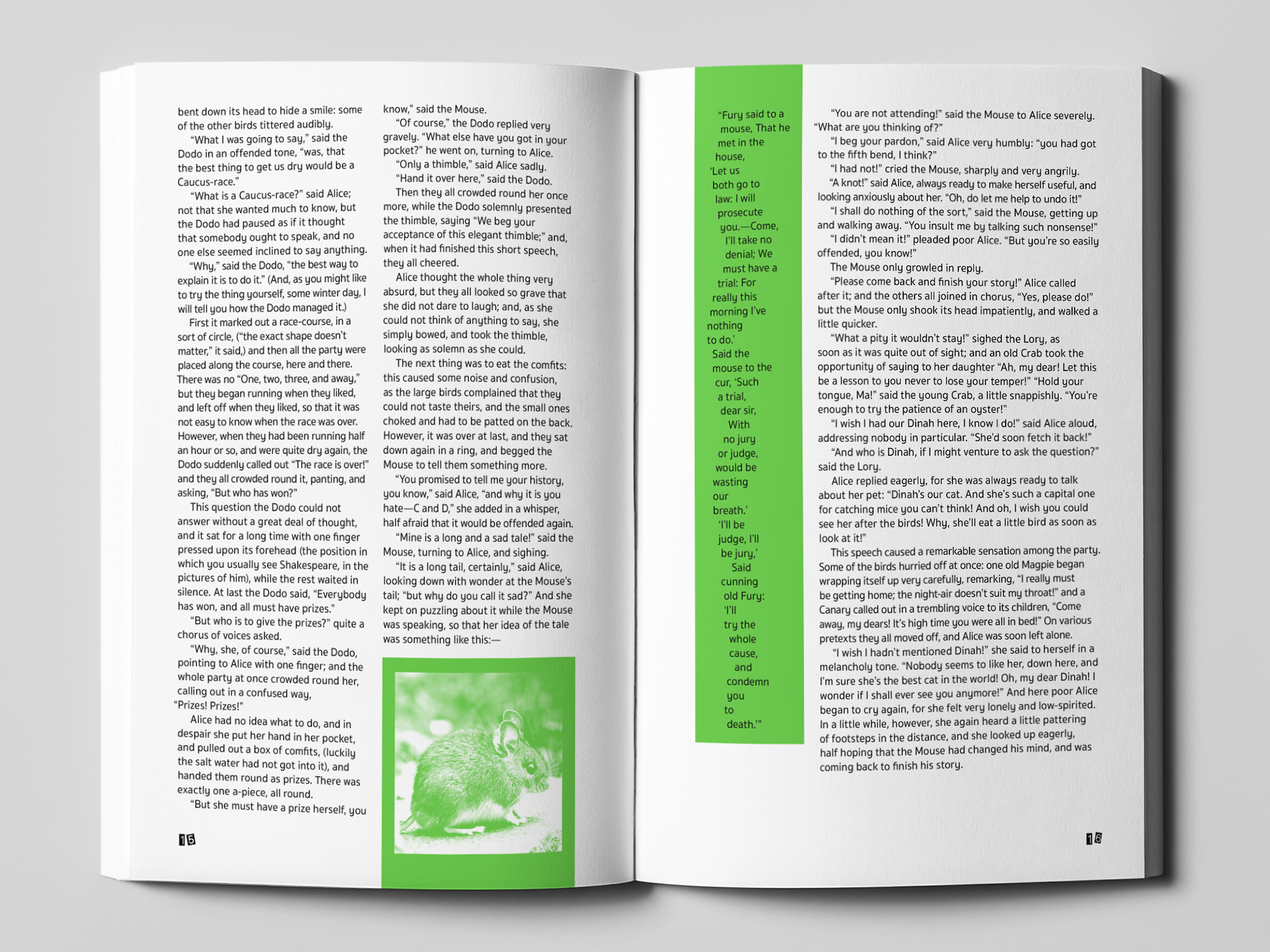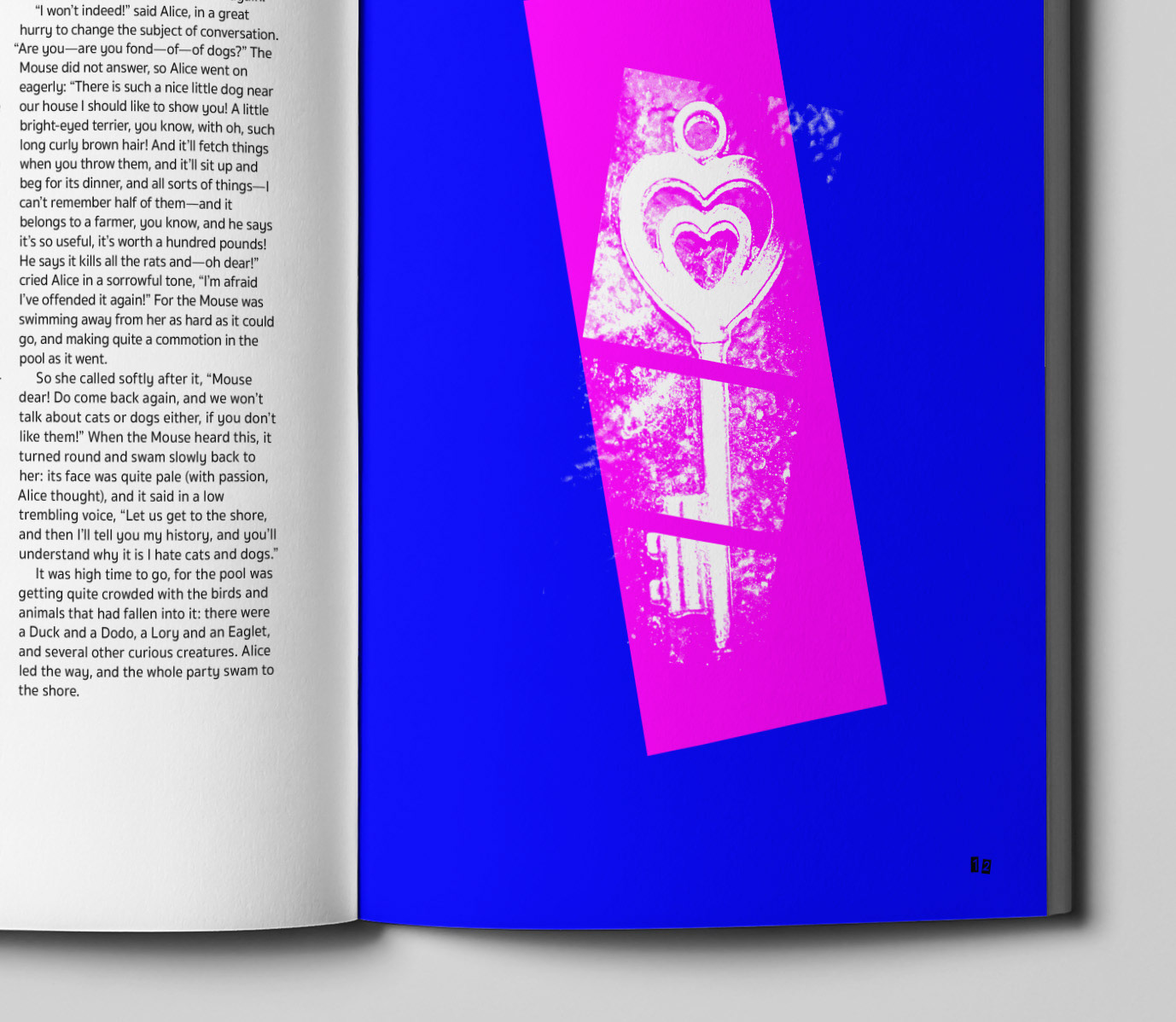 An eerie approach to “Alice’s Adventures in Wonderland” using vibrant colors, photographs, and experimental type. Won a AIGA Flux Award